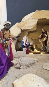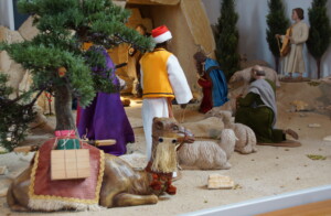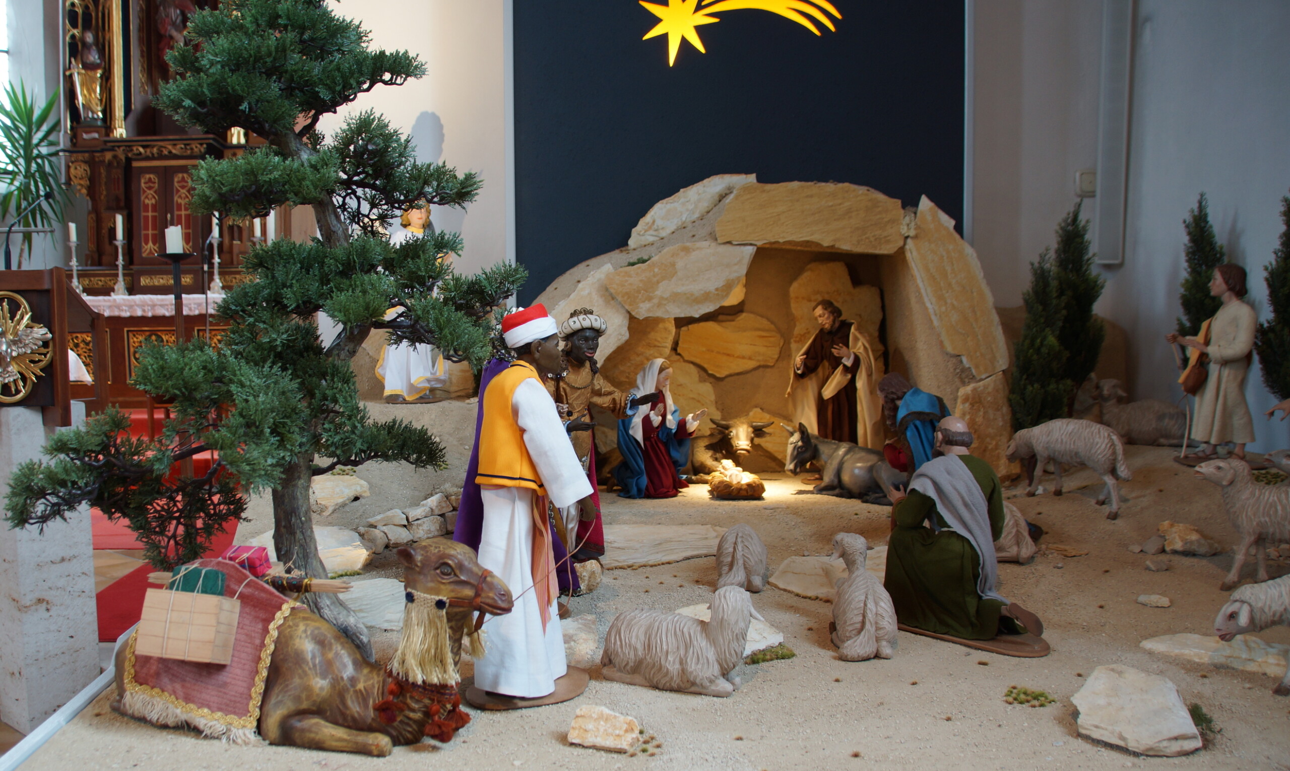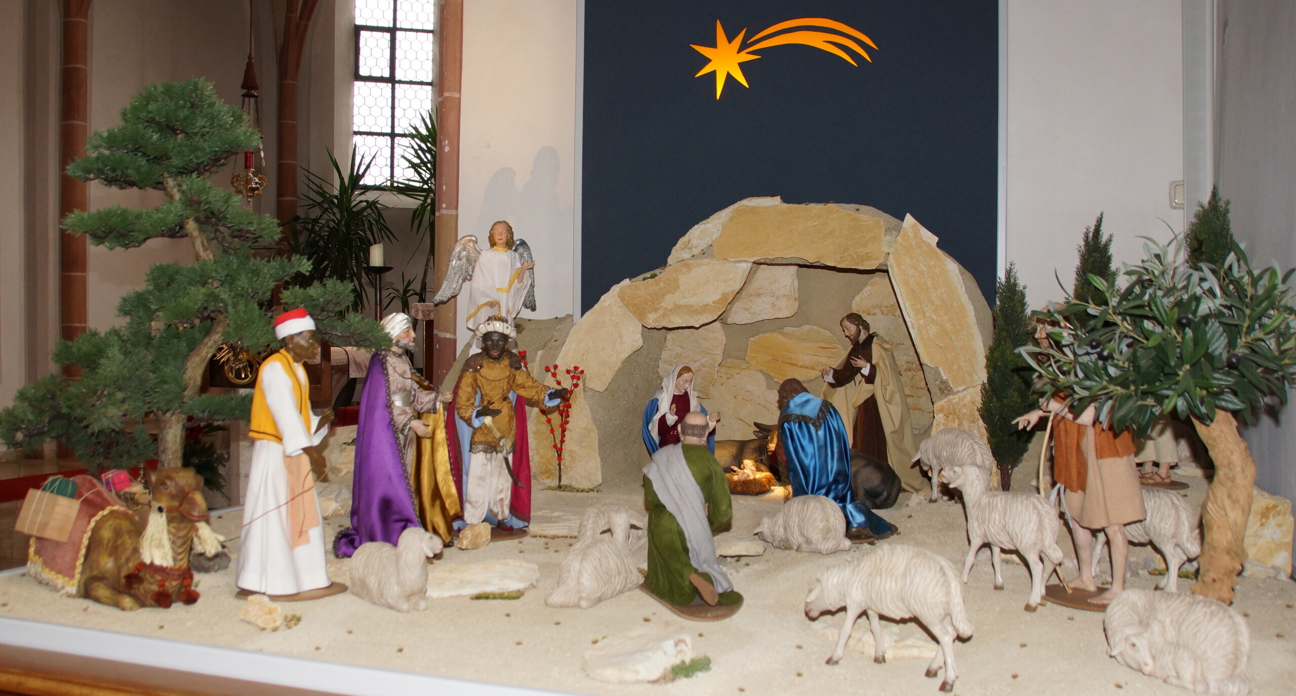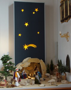 Inspiration dafür waren die pfarreieigenen Figuren, die im orientalischen Stil ausgeführt sind. So entstand eine Hirtenfeldlandschaft mit einem Sternhimmel als Hintergrund.